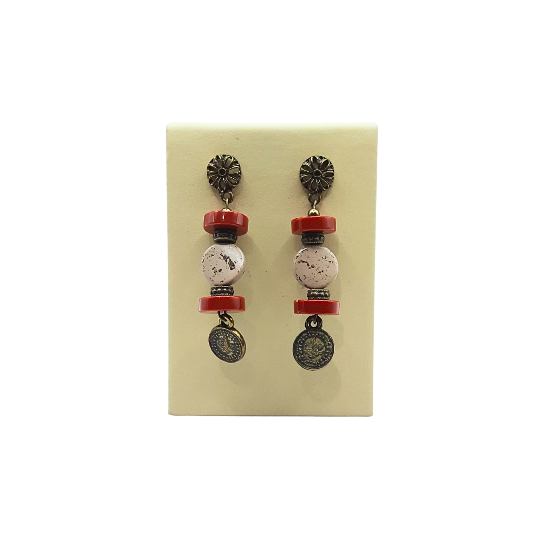 O Brinco Aparigraha com disco nude, disco de madeira e pingente moeda ouro velho, representa o desapego e a busca por um modo de vida simples.