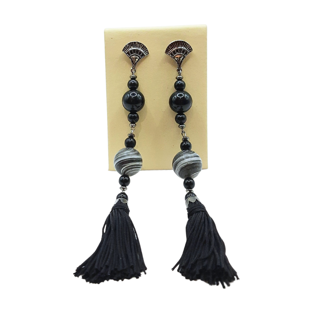 Em tons de preto e cinza rajado com tassel preto o Brinco Segredos apresenta design exclusivo para deixar sua produção ainda mais única.