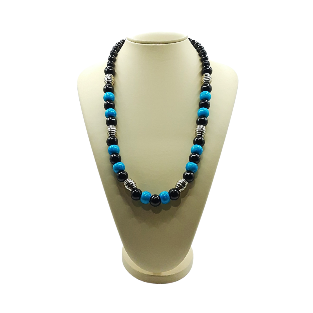 O Colar Aquarius em turquesa e preto valoriza seu look com brilho e estilo. Seu contraste de tons claros e escuros o torna uma peça versátil. Combina bem com looks básicos do dia a dia.