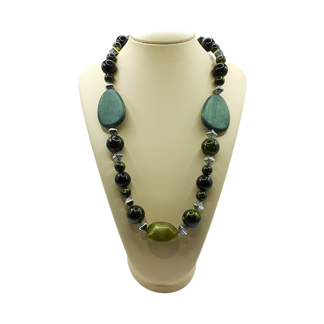 O Colar Intercâmbios em verde com preto e prata compõe um look elegante. A mistura de formas e cores se destaca na peça. Os variados tons de verde se complementam com elementos em preto e intervenções de prata. Com design exclusivo o colar traz formas geométricas e orgânicas dispostas de forma criativa e original. Ideal para iluminar sua produção.
