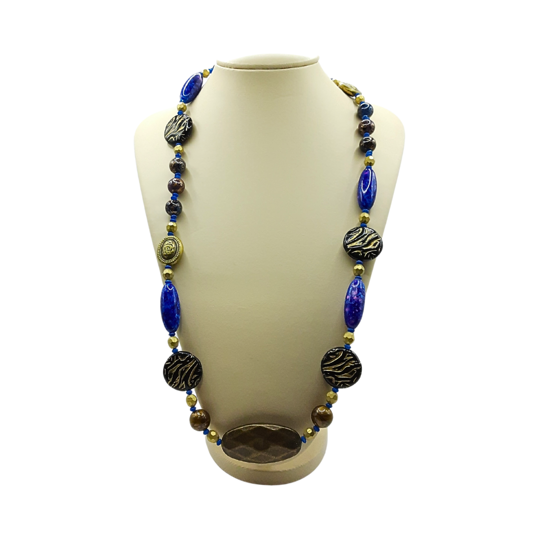 O colar Místico com cilindro azul esponjado, placa ouro velho, placa preta rajada dourada, camafeu ouro velho, bola dourada, bola azul/roxo manchada e bolinha dourada sextavada, é indicado para mulheres espiritualistas voltadas para a contemplação.