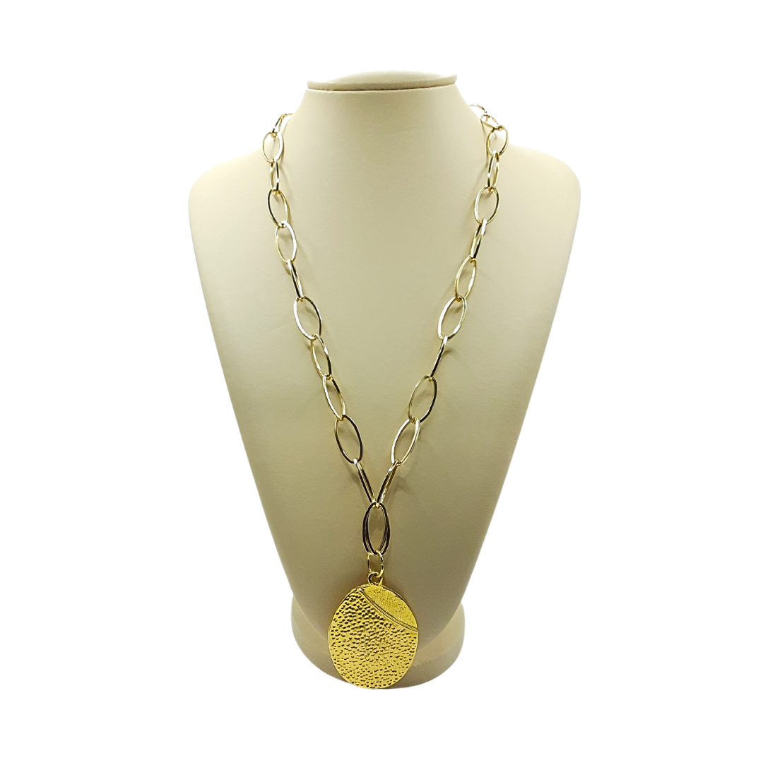 O Colar Aban elaborado com corrente dourada e pingente dourado trabalhado, simboliza fortaleza e autoridade.
